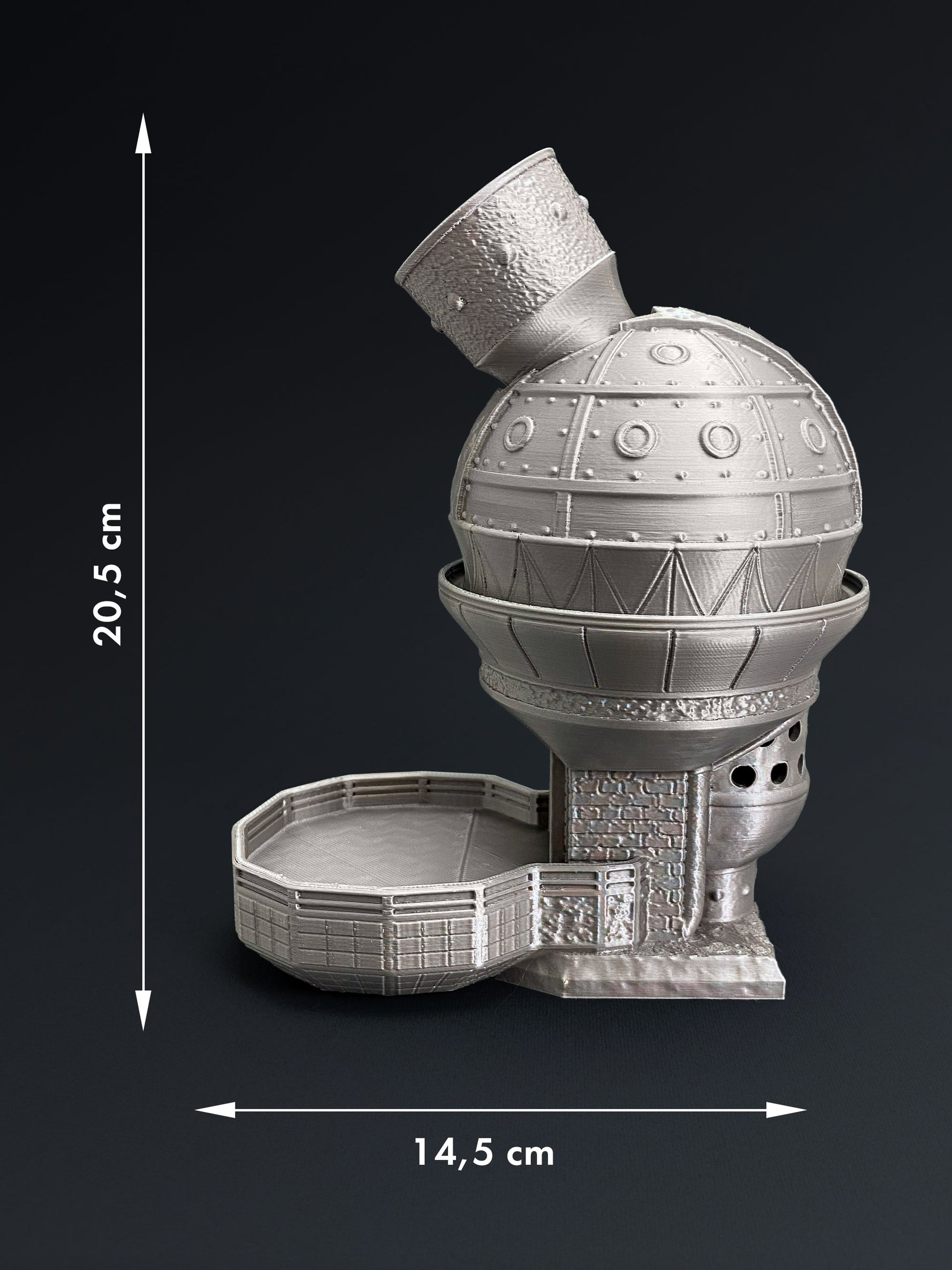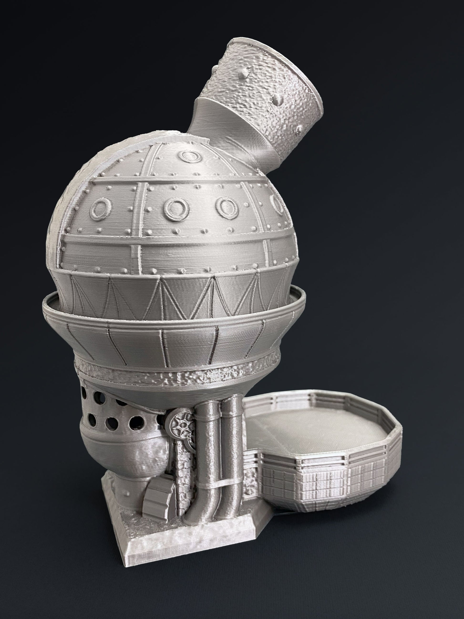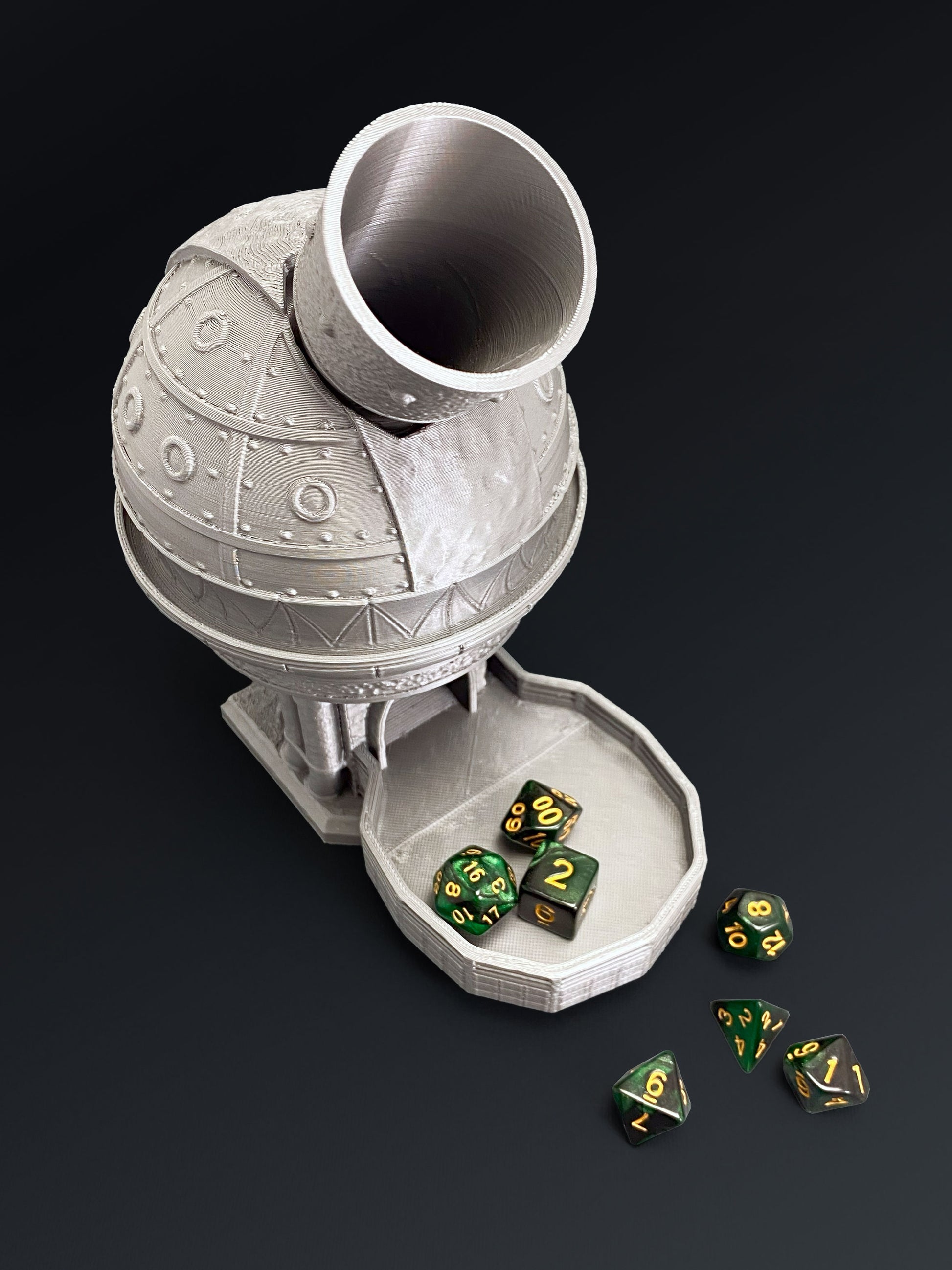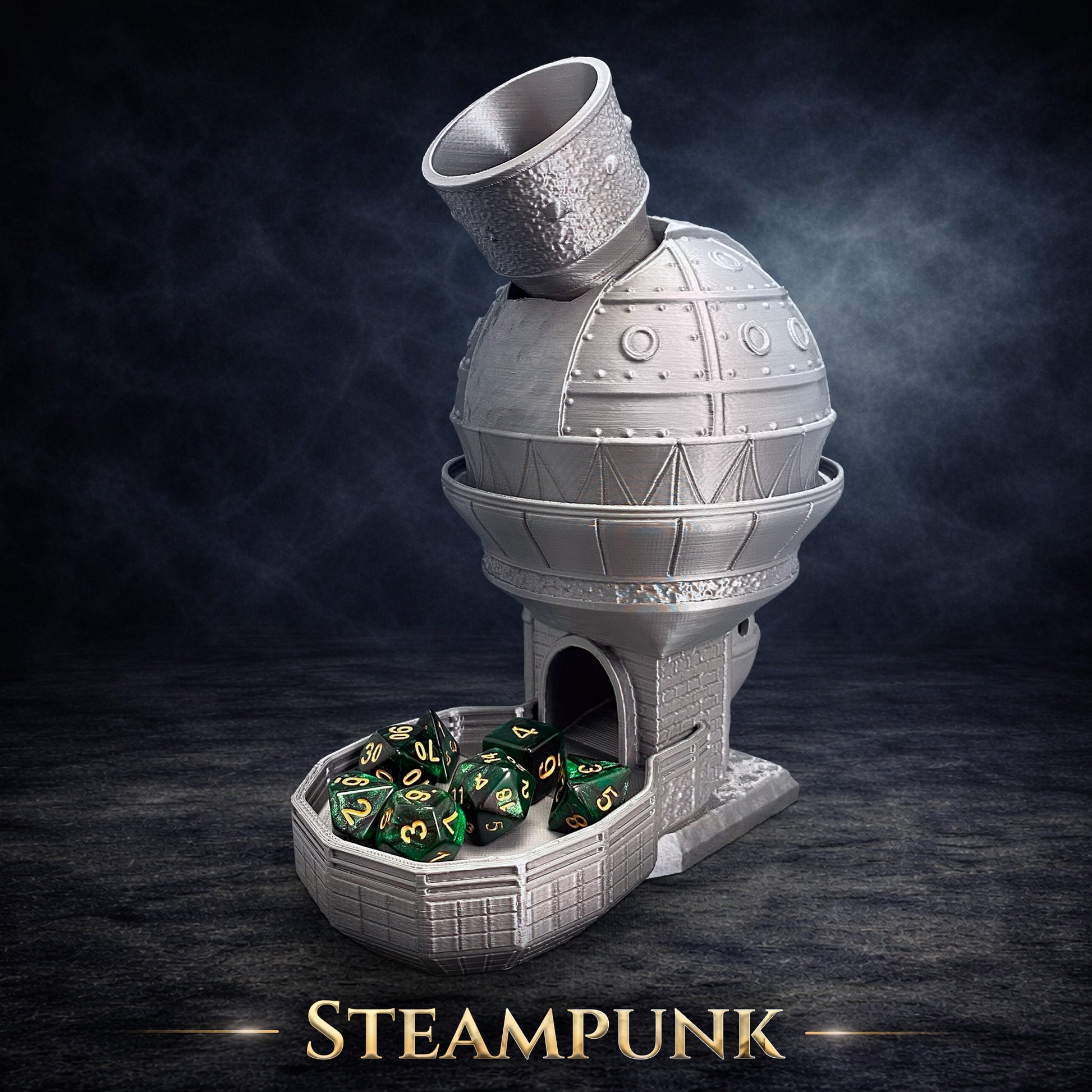 The Steampunk Dice Tower is a distinctive tabletop accessory designed for Dungeons & Dragons, Pathfinder, and other role-playing games. Inspired by classic steampunk aesthetics, this dice tower blends mechanical details with fantasy style, making it a striking centerpiece for any gaming table.